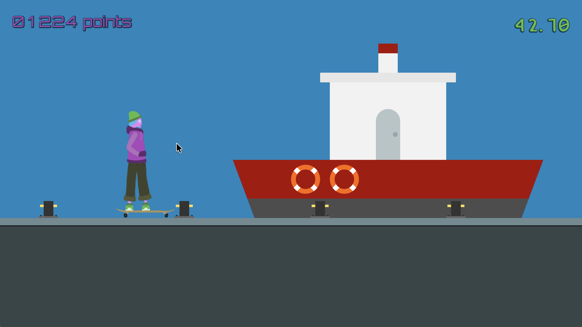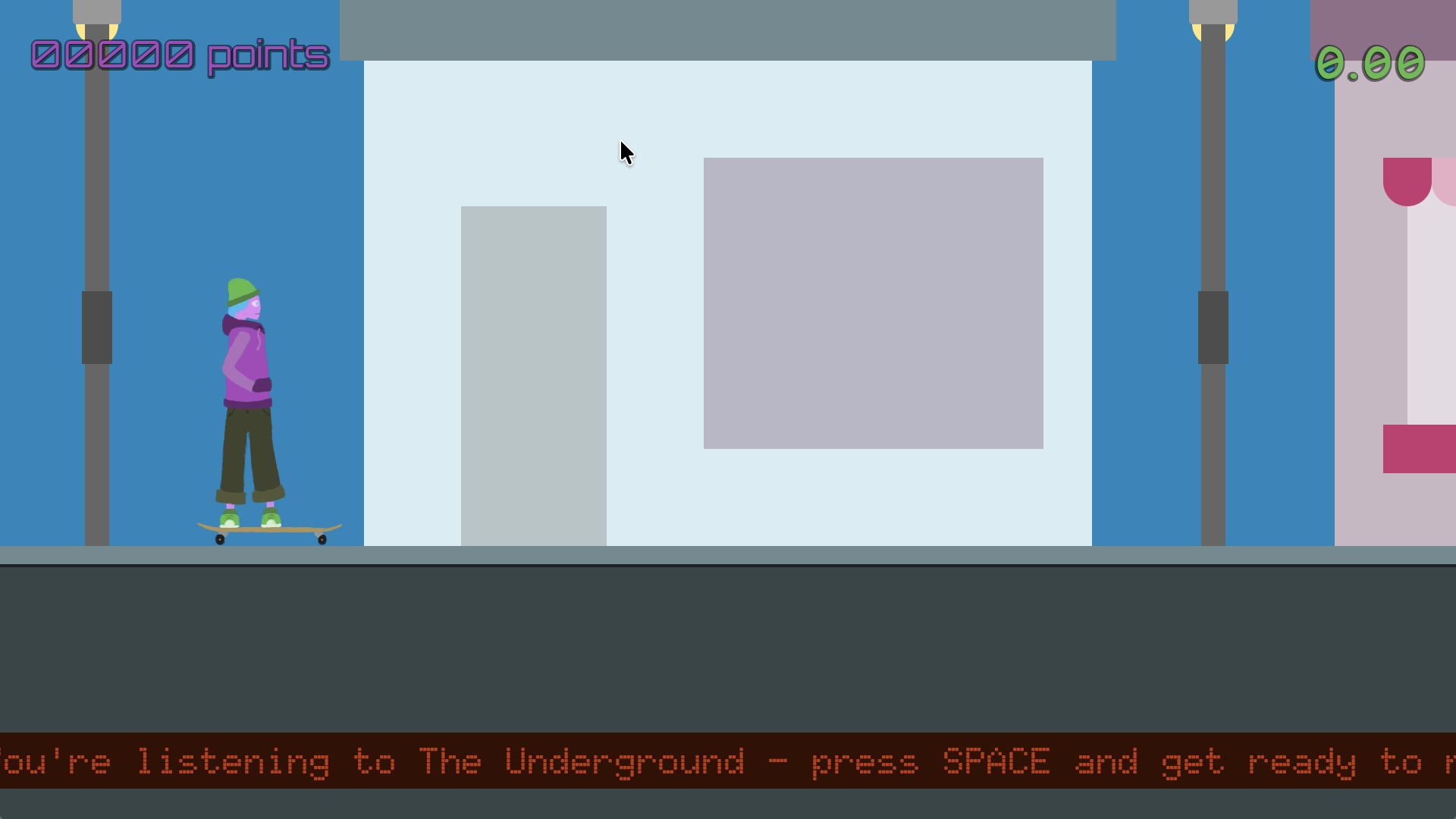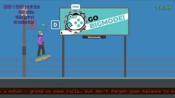 In Slick Tricks, you skate through the city, ollie-ing over and grinding along obstacles. As an up and coming skater, the skate scene has it's eye on you, and you'll be evaluated on how slick you skated by the pros on The Underground when you reach the end at the dock.