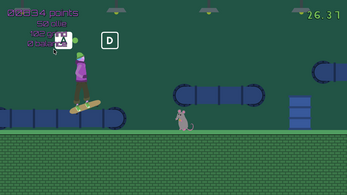 This is the first time I've made a platformer or a skating game, and I'm pretty pleased with how it turned out. It's also the first time I've done significant art for a game, combining drawn player sprites (using Procreate) and other vector assets (using Inkscape). The only pre-made assets I used were for input prompts, fonts and audio (see full credits below). There are a few rough edges in the grinding mechanic, but over all the game seems to work quite well (though I'm sure people will find plenty of bugs I didn't).